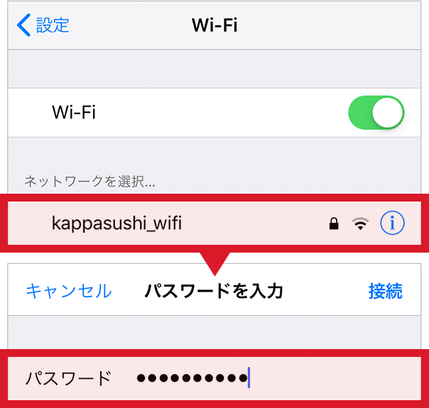 「kappasushi_wifi」をタップし、パスワードに「kappasushi」を入力してください。